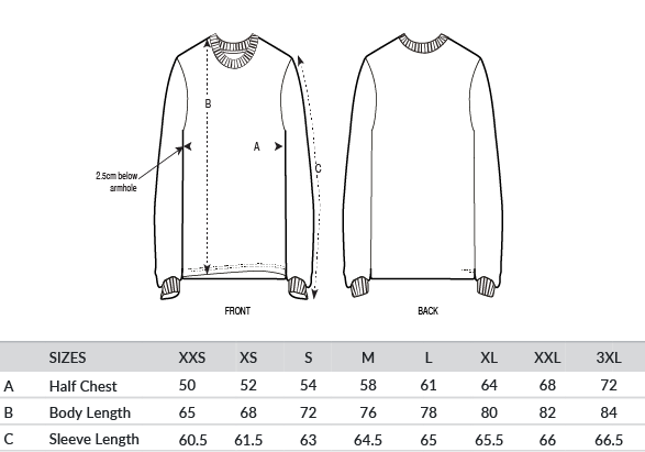 Set-in sleeve. 1x1 rib at neck collar and sleeve cuffs. Double-needle topstitches at the bottom hem. Inside back neck tape in self-fabric. Slightly rougher fabric characteristic.
